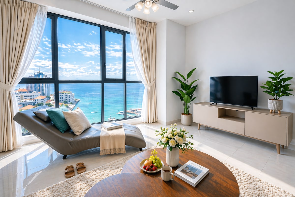 You will love this marina location for its serenity and tranquility. Enjoying the huge 110m2/1200ft2 corner unit's unique Dual View.....relaxing sea-view from the cozy frontal balcony and the natural sun light (and view) from the side windows. Decorations are kept to the minimal to suit to your feeling of spaciousness while providing a functional home with sufficient electrical appliances for your comfort. We are a husband/wife team who understands the needs of a family or a small group.