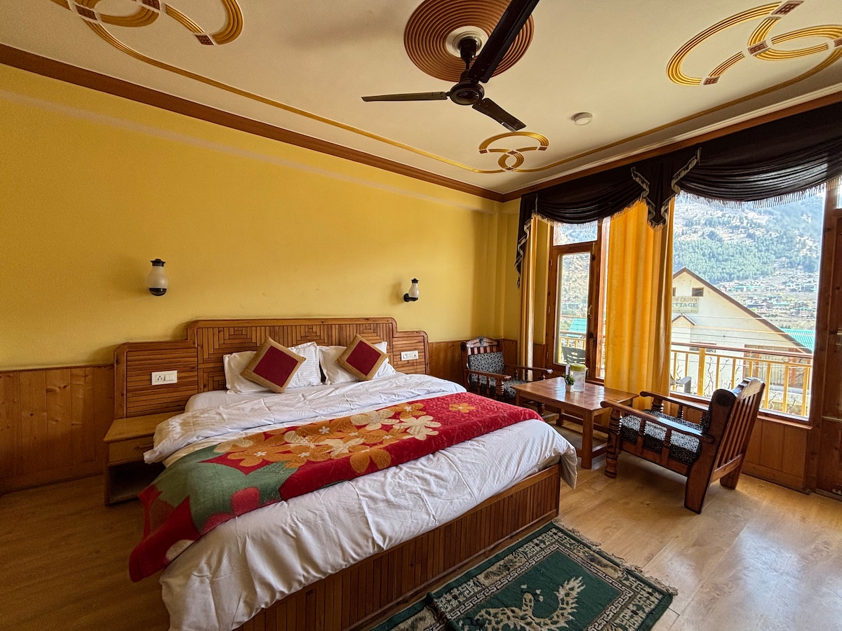 Cozy private room at Akari Inn with a dedicated workspace, scenic balcony, and access to a comfortable common area. Perfect for work-from-mountains or a peaceful getaway. Located near Naggar with easy access to Manali & Kullu. Free parking available. • outside food not allowed.