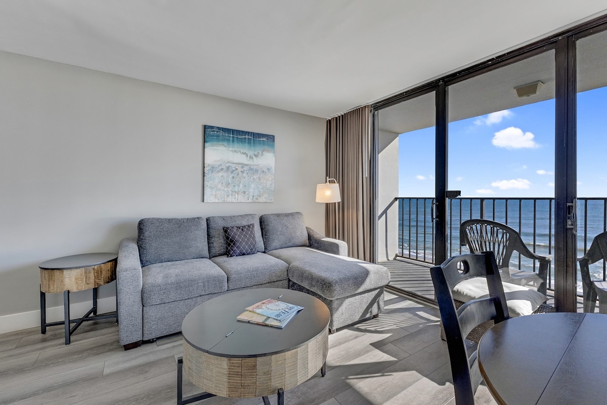 Welcome to your perfect beach getaway! This bright and cheerful 1-bedroom, 1-bathroom oceanfront condo is located on the 3rd floor, offering beautiful sweeping views of the Atlantic right from your living room and balcony. Freshly updated with vibrant blue accents and stylish coastal decor, the condo sleeps 6 comfortably with a king bed in the master, a sleeper sofa in the living room, and built-in bunks in the hallway alcove Perfect for families or a group of friends.