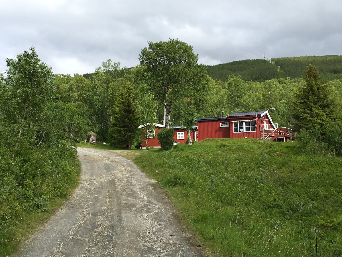 Du bor 5 min fra flyplassen, og likevel i naturen. Noen meter fra havet og en elv som renner ut i havet her. Rundt husene kan du oppdage mangel ulike dyr. Rein kommer ofte forbi. Elg kan komme en raskt tur innom. Ellers springer det oter og røyskatt rundt husene. I havet svømmer sel og en sjelden gang delfiner. Et ypperlig sted for å observere Nordlys - og er det vindstille speiler det seg i havet også. Tromsø sentrum- buss, ca 15 min. Sauna kan leies når du bor her- avtales senere .