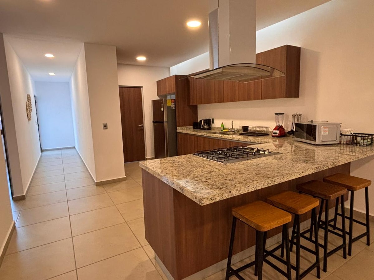 Moderan udoban dvosoban stan, bazen, klima-uređaj, Wi-Fi, teretana, 24-satno obezbeđenje. Jednostavan pristup svim sadržajima. 10 minuta hoda do plaže Chahue 5 min. hoda do restorana, kafića i namirnica. Jedinica u Miksiju, pored Čedije, mirnog ugla Čahuea. 15 minuta hoda do Santa Kruza ili jednostavno idite taksijem do ostalih 30 plaža u ovoj oblasti!