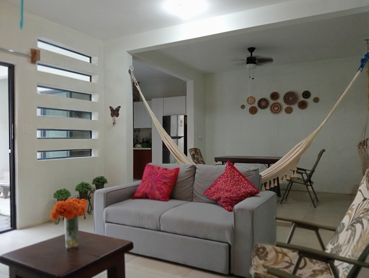 Habitación amplia, tranquila y confortable, perfecta para descansar después de un día de actividades en la playa. Tiene baño privado dentro de la habitación, aire acondicionado, ventilador y WiFi. La habitación se encuentra dentro de nuestro hogar, ubicado en una zona segura y de fácil acceso. Vivimos en la propiedad, por lo que estaremos disponibles para apoyarte. Como huésped, tendrás acceso a las áreas comunes de la casa. Nos encanta ofrecer un ambiente cálido, familiar y respetuoso.