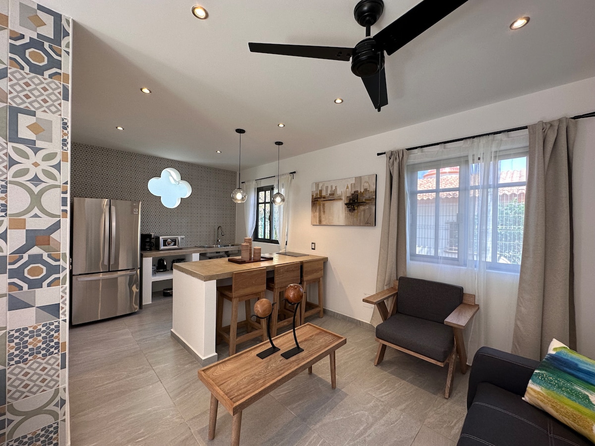 Svež i moderan stan za nezaboravan odmor sa porodicom ili za rad u pametnom poslu. Ukrašena prelepim detaljima zbog kojih ćete se osećati kao da ste u svojoj kući. Opremljen i sa visokokvalitetnim sadržajima: internet 200 mbps, mašina za pranje/sušenje veša, pametni TV, topla voda i klima-uređaj. Nalazi se na 2 minuta hoda od plaže Santa Kruz i u blizini restorana, prodavnica i pijaca. Takođe ima zajednički krov odakle možete da vidite okean.