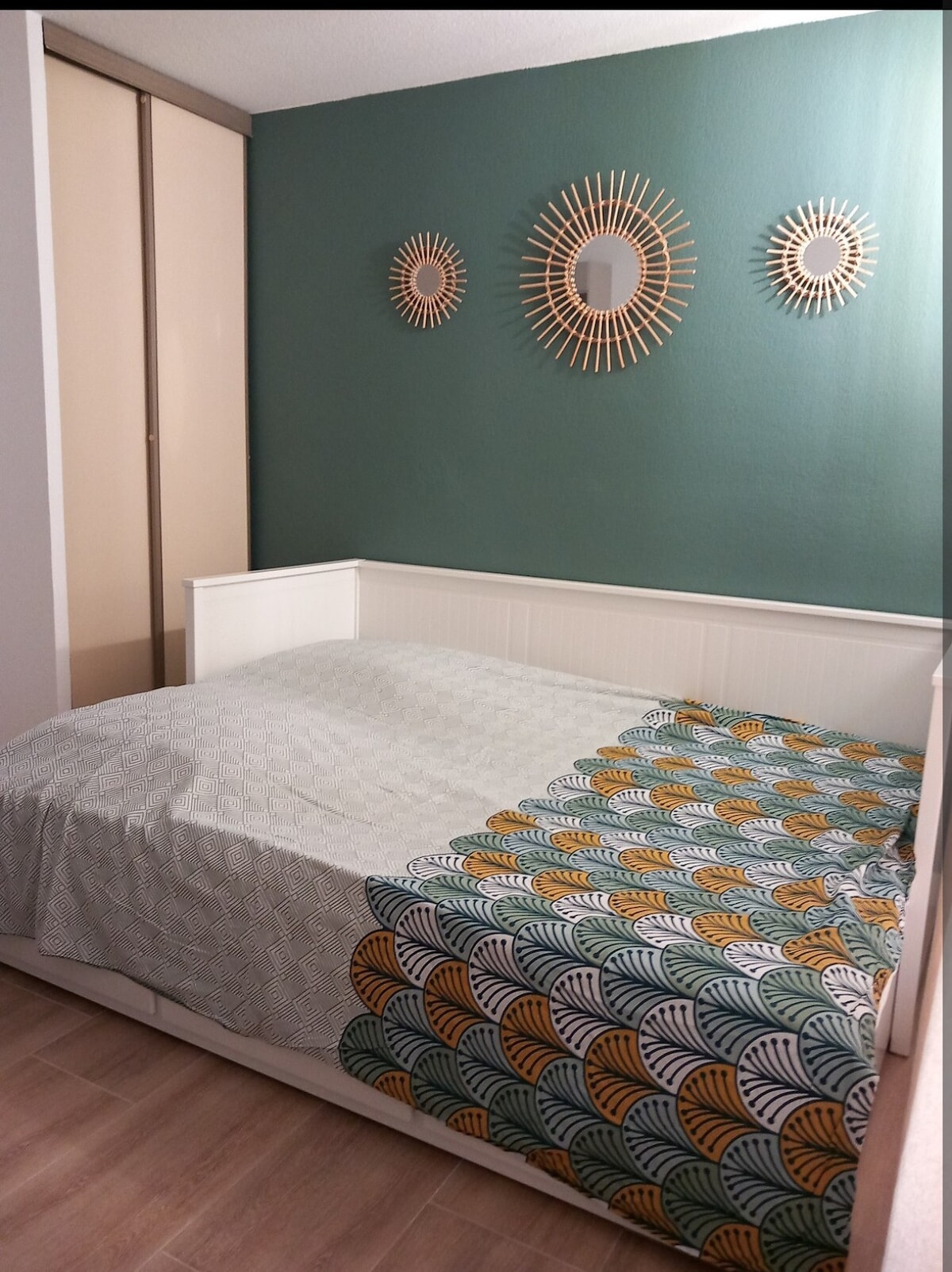 Grand studio de 26m2, meublé et climatisé, pouvant accueillir de 2 à 4 personnes (idéal deux parents et deux enfants). Sans parking mais situé à 5 minutes, à pied de la plage et des commerces. Orienté à l'est, au 3eme étage, sans ascenseur, dans une résidence privée et arborée. Il comprend un séjour avec deux canapés lit BZ, un coin cuisine, une salle de bain avec douche (refaite au printemps 2025) et WC, un balcon avec table et chaises.