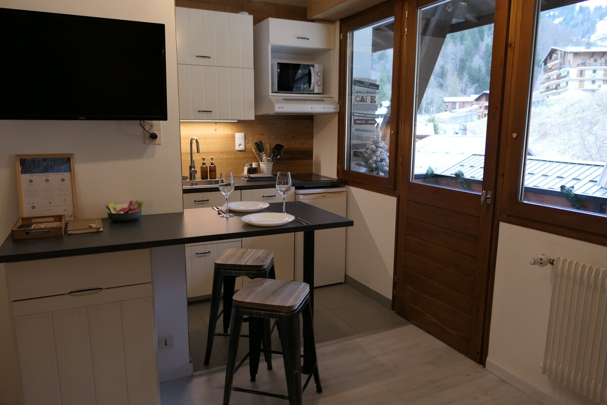 Appartement cosy, neuf, entièrement équipé. Situé dans un lotissement calme, en rez de jardin avec grande terrasse vue sur la chaine de l'Etale au cœur des Aravis. Il est composé d'un espace cuisine tout équipé, un coin repas salon, une chambre et une salle de bain. Possibilité de recharge véhicule électrique et accès au sauna sur réservation. Situation idéale, village de La Giettaz à un kilomètre ou vous trouverez une épicerie boulangerie, un tabac presse, deux restaurants . v