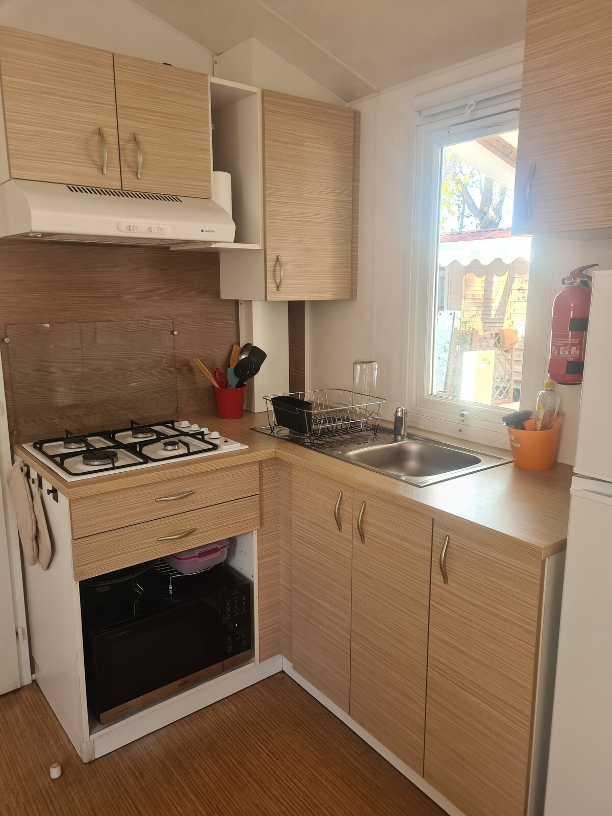 Klimatizovana mobilna kuća sa natkrivenom i opremljenom terasom. 2 chbres, 1 sa 1 bračnim krevetom, 1 sa 3 kreveta za jednu osobu, uključujući 1 visi za djecu do 6/7 godina. 1 kabriolet prostor 2 osobe iz stambenog prostora. posteljina je obezbijeđena! kupatilo. Zaseban toalet. mikrotalasna pećnica, aparat za kafu, čajnik, frižider sa zamrzivačem. roštilj. TV. Pas ( sf mačka 1, 2 ili može biti problem u ponašanju) mačka prihvaćena u okviru ograničenja jednog kućnog ljubimca po boravku. Sobe su zabranjene za kućne ljubimce ili ćebad!!