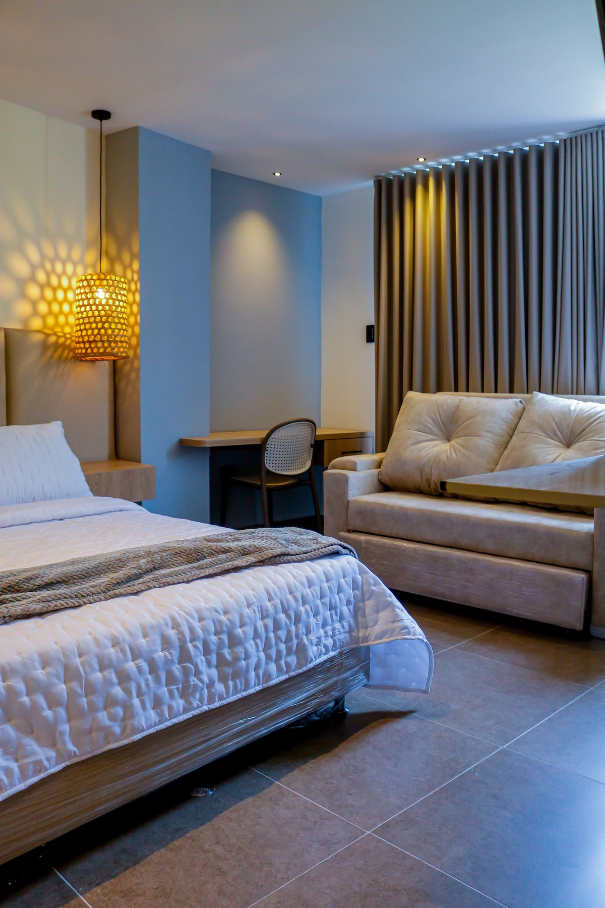 • Disfruta esta elegante habitación frente a la piscina. Elije 1 de estas opciones de descanso: a) 1 cama King para pareja (inmediata) b) 2 camas sencillas para amigos o compañeros de viaje. (con consulta previa) • SmartTV 50" y Wifi 5G • Neverita y Cafetera • Amplios espacios abiertos con naturaleza al rededor. • Parqueadero gratis • Pet Friendly • Ubicación increíble en Valle Plaza, zona gastronómica y a pocos metros cerca de la Fuente. Descuento a partir de 2 noches.