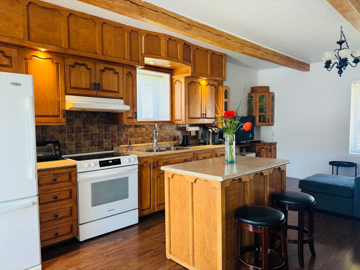 Topla kuća u Gaspésieju koja se nalazi na visoravni iznad zaliva. Prekrasan panoramski pogled. Velika parcela s pogledom na brda. Kuća se nalazi na pet minuta vožnje od centra grada, gde možete pronaći prodavnice namirnica, banke , apoteke, SAQ... Sve je spremno Route du Parc de la Gaspésie. More nije dostupno iz objekta, ali je udaljeno nekoliko minuta hoda. TV,Wi-Fi,DVD, knjige i igre. Novo: Stanica za punjenje električnih automobila.
