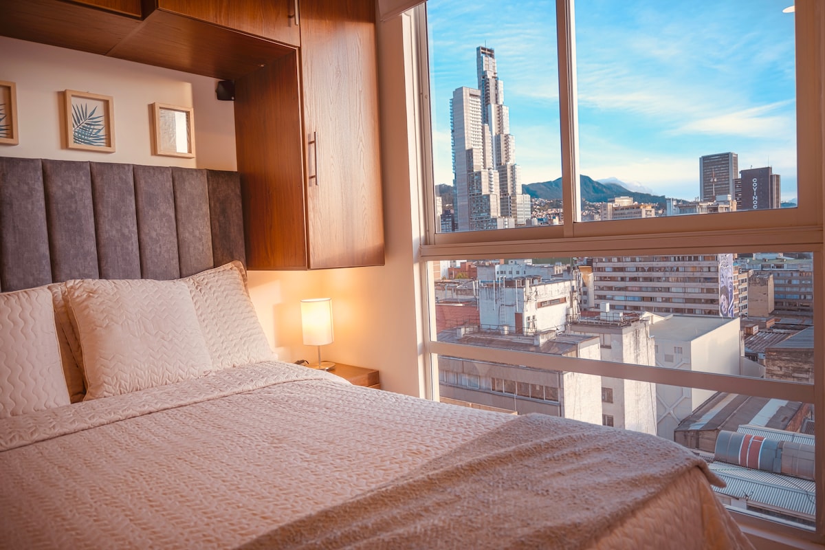 Stunning loft with breathtaking city & mountain views. Indulge in the most luxurious bed in the building, providing a level of comfort akin to a five-star hotel. Plush pillows ensuring the best sleep of your life. Enjoy a 60" TV with Netflix, a well-equipped kitchen, and relax in the easy chair by the window. Hot water shower, Hairdryer, ample closet space, and a perfect work area. Upcoming amenities: rooftop, coworking, gym. Close to Transmilenio station. Book now for an unforgettable stay