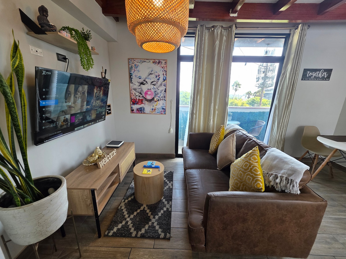 Uživajte, pobjegnite, odmorite se i radite u ovom mirnom i elegantnom prostoru. Imaćete 2 velika pametna ekrana od 50 i 43 inča Nalazi se u centralnom i bezbednom području. Ima prelepu terasu i pogled na park. Tržni centar je udaljen samo jedan korak, a bulevar, restorani, teretana, Starbaks i ambasada Sjedinjenih Američkih Država udaljeni su 5 minuta. Wi-Fi, televizori sa Netflix-om, Star+, radni sto, kuhinja i kućni aparati, bezbjednost i udobnost
