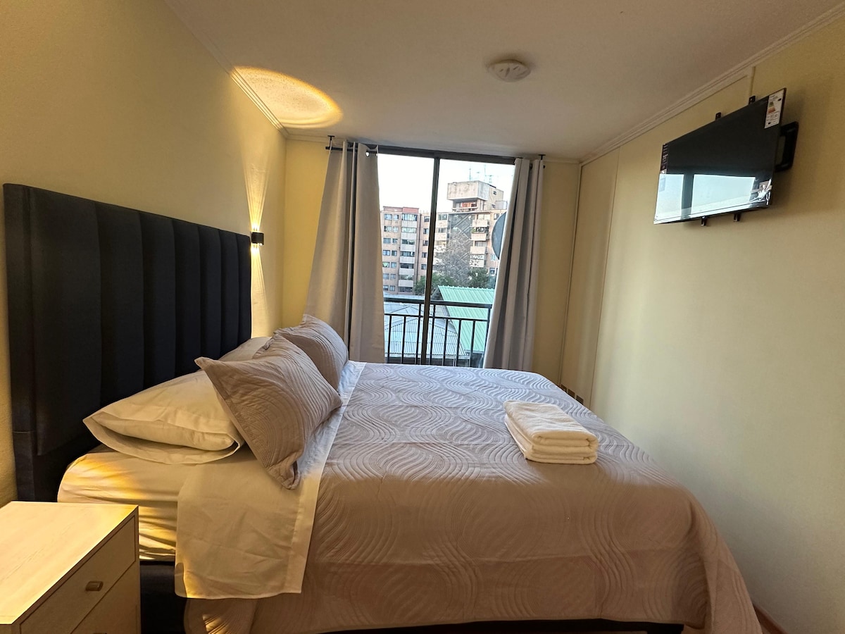 Studio apartment located in the heart of downtown Santiago, just steps from Santa Ana Metro station. Excellent connectivity and a prime location, close to the historic district (Plaza de Armas, Cathedral, Entel Tower, Santa Lucía Hill), shopping centers and the university area. The building offers a seasonal pool, BBQ areas, laundry facilities, gym and 24/7 security. The apartment includes WiFi, cable TV, Netflix and hot water. Ideal for tourism or business trips, comfortable and well located.