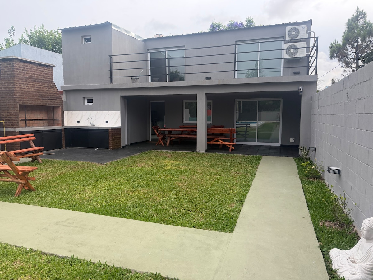 Casa entera de dos plantas ubicada en un mismo terreno con otra vivienda. Los espacios comunes (jardín, pileta y parrilla) se comparten. En planta baja cuenta con cocina equipada, heladera, mesa y sillas, y baño completo con ducha separada. En planta alta hay sillón cama de dos plazas, cama individual con opción de colchón adicional y escritorio. Dispone de aire acondicionado, calefacción y Wi-Fi. Ideal para una estadía cómoda y tranquila.