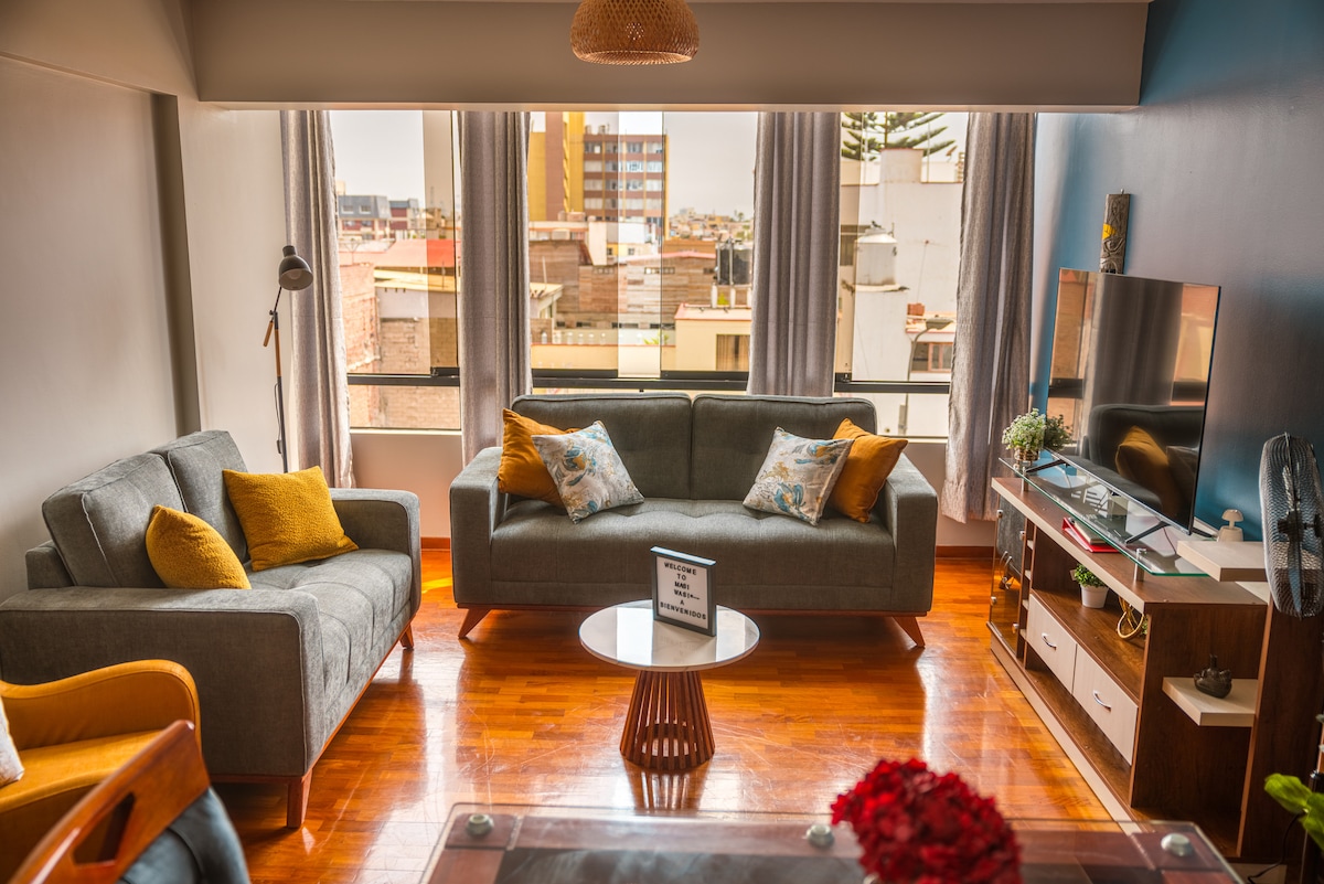 Uživajte u udobnom i modernom boravku u ovom potpuno opremljenom apartmanu, dizajniranom u elegantnom, svetlom i funkcionalnom stilu. Ima integrisanu kuhinju, moderne aparate, uredne prostore i pažljivo osmišljene detalje za vašu udobnost. Idealno za slobodna ili poslovna putovanja, nudi udoban boravak na strateškoj lokaciji u Limi, sa lakim pristupom turističkim, gastronomskim i trgovačkim područjima. Čist, bezbedan i savršen prostor.