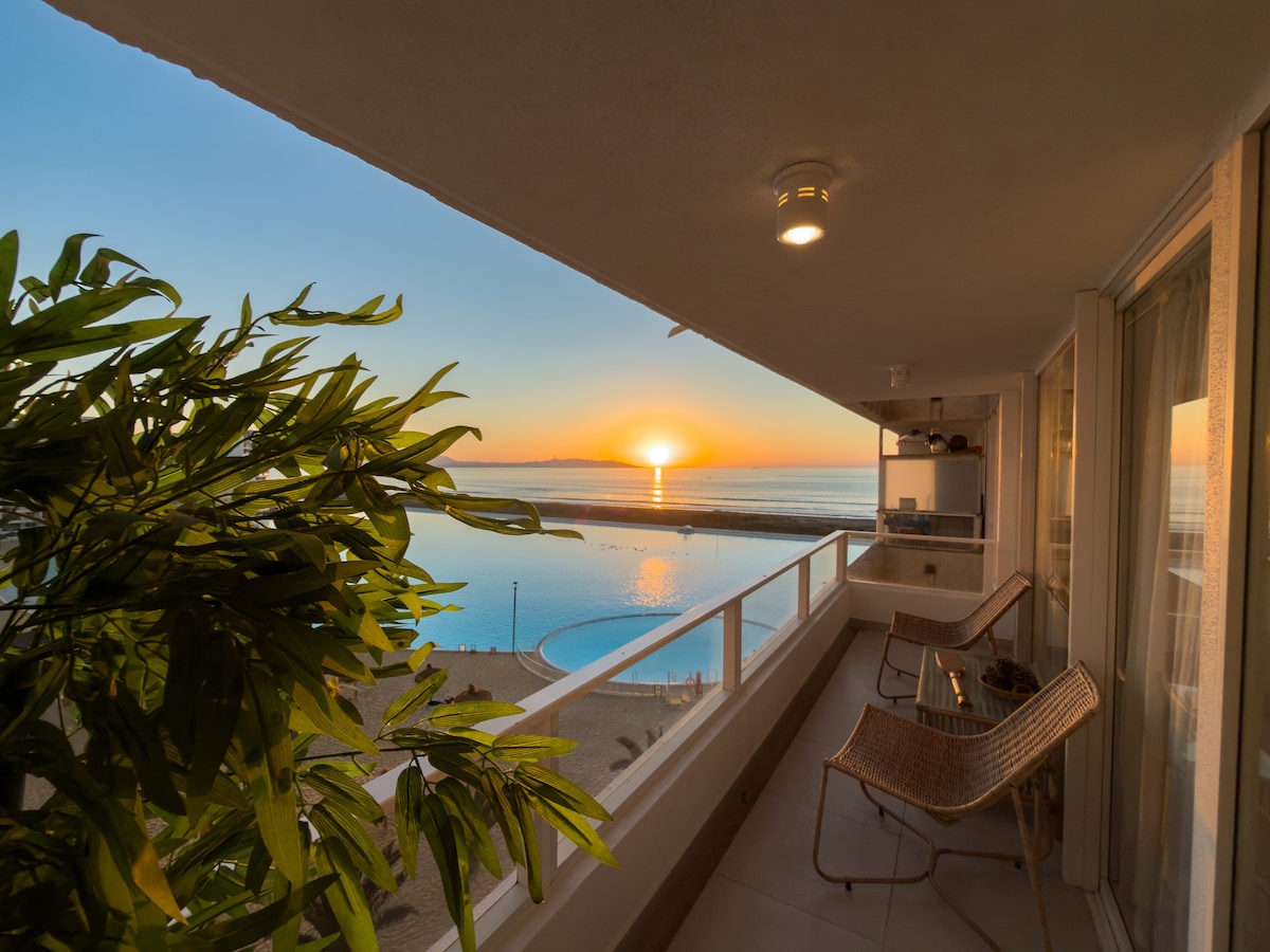Escapate frente al mar con tu familia. En cualquier época del año, sientete como si estuvieras en tu hogar. Atardeceres desde la terraza, donde se ve toda la bahía de coquimbo y la serena. En las noches cielos despejados y estrellados, respirando el aire marino. Todo esto frente del mar, piso 19, para 5 personas. A un costado del casino Enjoy. piscina al aire libre y vista al infinito. Kinchos Con vista panoramica. Estacionamiento gratis. Saliendo del condominio avenida costanera