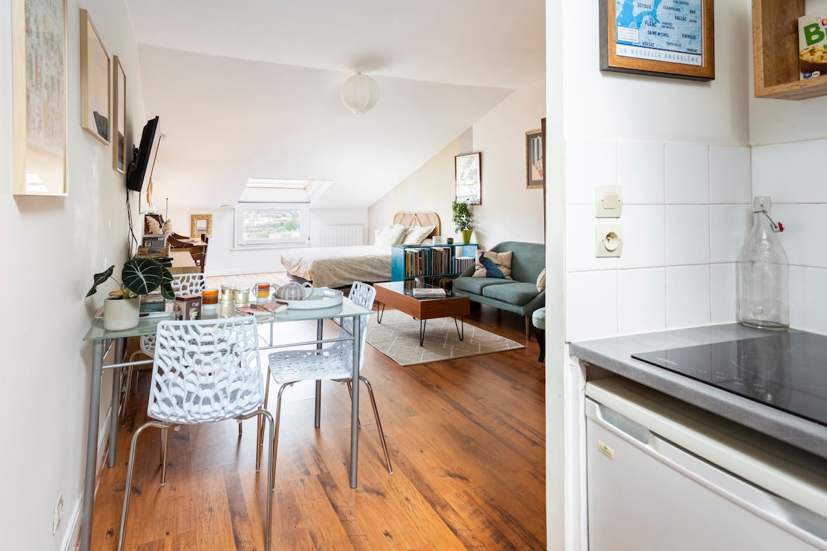 Uživajte u lokaciji u srcu četvrti stripova u Saint Cybard Angouleme, renoviranoj i dobro opremljenoj kući za 2 osobe. Restorani, pekare, mesnica, pijaca, duvan / presa, bioskop u krugu od 5 minuta hoda od kuće. Prizemlje - 1 dnevna soba/dnevna soba - 1 kompletna kuhinja - 1 potpuno renovirana tuš-kabina Pod - 1 spavaća soba sa velikim krevetom sa četiri postera - 1 radni sto kroz sobu.