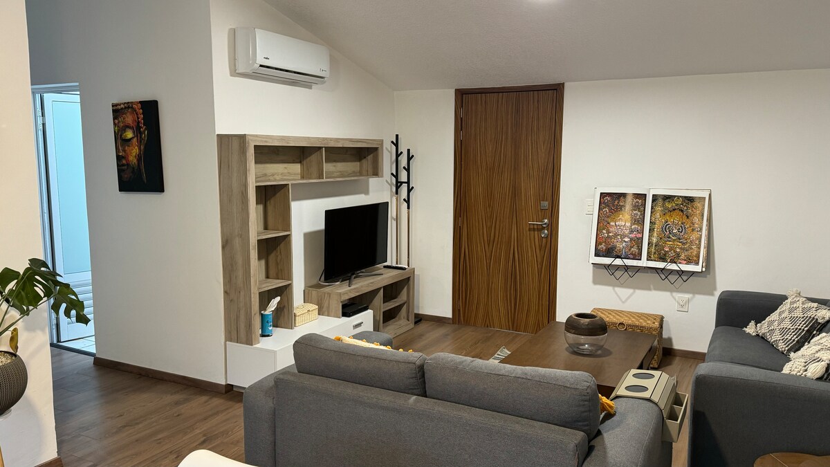 Relájate en este espacio tan tranquilo y elegante cuenta con internet, netflix todos sus muebles son nuevos, una recámara queensize y la otra matrimonial, los dos cuartos cuentan con mini splite, frente a la casa cuenta con tienda de abarrotes, a 200 metros lugares para cenar, muy cerca de Periferico y del aeropuerto a 20 mn.