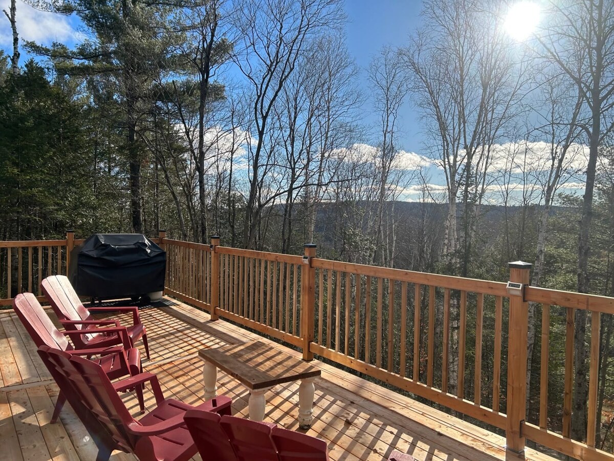 Planinska kuća sa izuzetnim panoramskim pogledom 1 sat i 15 minuta od Montreala. Privatni direktan pristup reci za plivanje, unutrašnji i spoljašnji kamin, BBQ, terasu, ljuljačku i još mnogo toga! Mnoge aktivnosti u blizini (spa centar, drvo, skijanje, krpljanje, planinarenje, quad biciklizam itd.). Savršeno i za rad na daljinu uz brzi Wi-Fi (svjetlovodni). Broj objekta: 227290