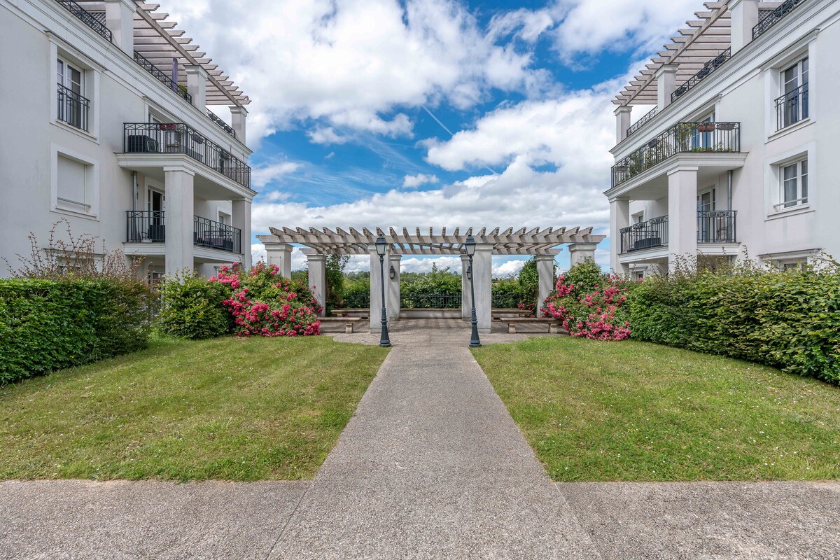 Dobro došli u ovaj zadivljujući stan od 63m² sa namještenim balkonom, potpuno renoviran i elegantno uređen. 📍Uživajte u VRHUNSKOJ lokaciji: 🏰 4 minuta automobilom do Diznilenda 🚊 1,5 km od stanice RER sa direktnim pristupom Parizu za 35 minuta 🛍️ 5 minuta hoda do Val d'Europe & La Vallée Village Outlet Dostupna su 🅿️ 2 privatna parking mjesta. 🛌 Opremljen za 4 gosta, može da ugosti 6 (dodatna posteljina). Svaki detalj je pažljivo osmišljen kako bi vaš boravak učinio jedinstvenim i nezaboravnim.