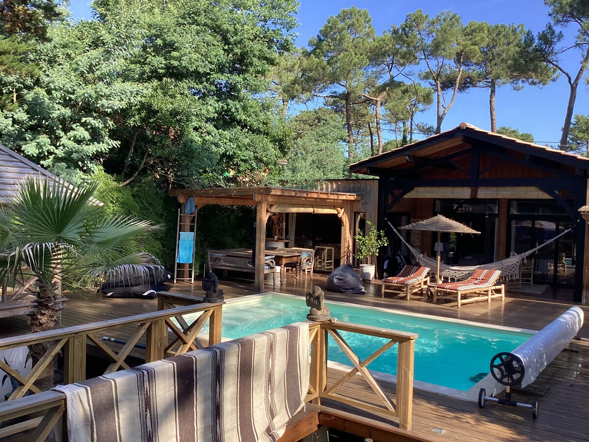 Prelijepa arhitektonska kuća iz 70-ih: girole (koju je kreirao arhitekta Pjer Lajus). na parceli od 800 m2 ispod borova, 8 minuta hoda od južne plaže i 15 minuta hoda od centra grada. Nalazi se u slijepoj ulici sa vrlo malim prolazom ( savršenim za djecu)u jednoj od najtraženijih i najmirnijih četvrti u Lakanu Okeanu. Vrlo opuštajući ambijent u srcu borove šume u blizini okeana i šume.