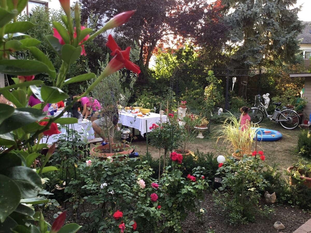 Iz ovog centralno lociranog doma ćete biti na svim važnim mestima u tren oka. Zatvoreni bazen i mali supermarket koji radi non-stop u blizini (oko 300 m). Javnim prevozom možete brzo doći do Hajdelberga i Manhajma. Imamo ukupno 3 psa u objektu, koji su takođe privremeno u zajedničkom dvorištu.