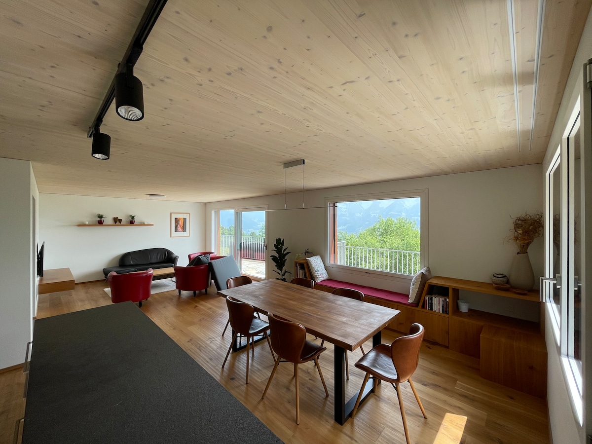 Private suite on the top floor of the owner-occupied Villa Wilen, directly on Lake Sarnen, unique alpine views, sunrises Spacious bedroom with home cinema, the panoramic lounge, large kitchen and bathroom (all privat area). For 3–5 guests, an additional private bedroom with bathroom is provided one floor below (lift access - shared area). Lake and garden access, SUPs, free parking & WiFi. Children welcome, small dogs only. Most popular Swiss Airbnb. Most highlights are reached within 1 hour.