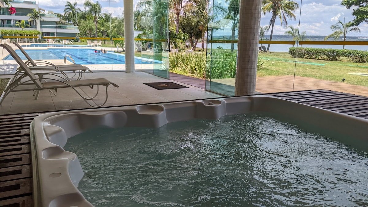 Experiência de hotel completa! Kit completo com roupas de cama, itens de banho e cozinha, limpeza com camareira após cada hóspede, limpeza adicional durante estadia sob demanda do hóspede mediante valor à parte. 1 vaga de garagem, checkin pela recepção. Piscina, academia, sauna, restaurante, bar, conveniência 24h, jacuzzis compartilhadas, lavanderia, decks à beira do lago. Restaurante com bar, almoço e jantar a la carte. Loja de conveniência no lobby com opções de café da manhã.