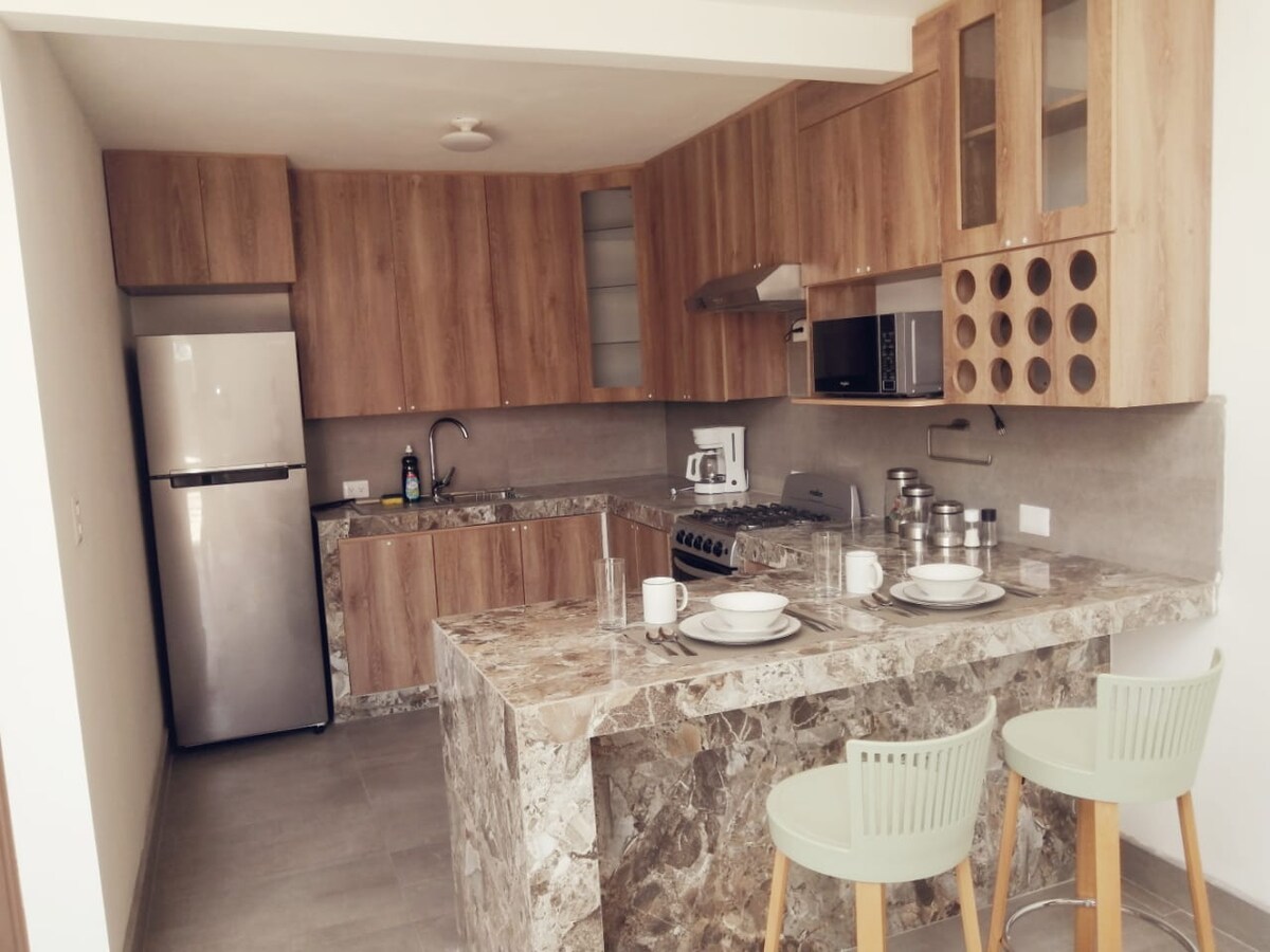 Bello apartamento con la mejor ubicación a pasos de isla de flores y centro comercial maya Mall , a 5 minutos del aeropuerto internacional mundo Maya , con cocina completa y habitación con todas las comodidades tanto de entretenimiento como para tener un descanso reparador, en segundo nivel con lobby compartido