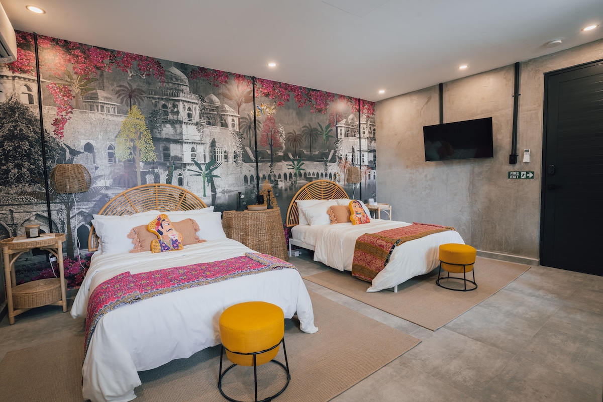 Step into the grandeur of Amara, where every detail evokes the eternal beauty of India. This spacious room is designed to offer a timeless experience. The two full-sized beds ensure a restful stay for up to four guests. Whether you’re traveling with family or friends, Amara promises a luxurious and comfortable stay.