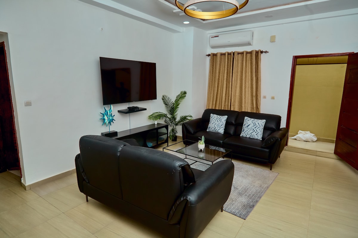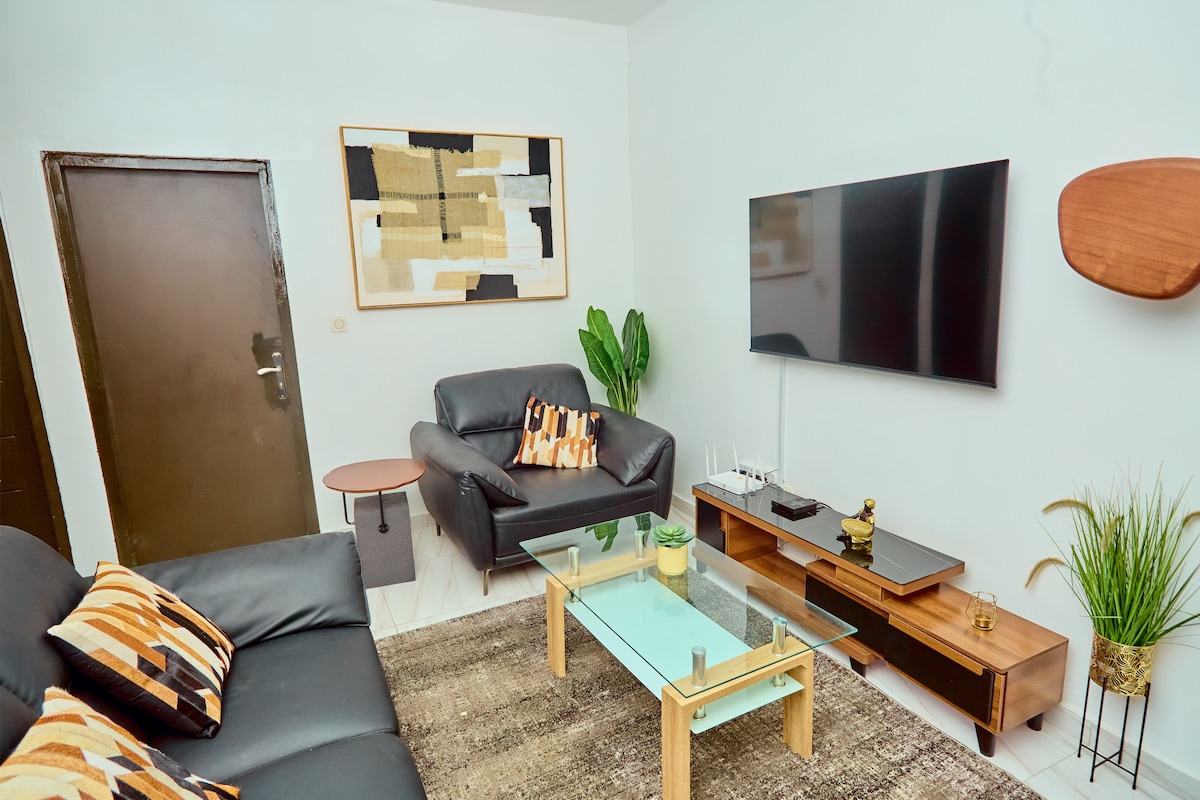 Ovaj stan nudi moderan i prijatan ambijent, idealan za opuštajući boravak. Stan je u blizini lokalnih sadržaja, a istovremeno nudi mirno skrovište kako biste u potpunosti uživali u boravku. Šta treba da znate prije rezervisanja •Struja: Brojač kartica, plaćate prema potrošnji. U prosjeku 5.000 do 10.000 FCFA sedmično (često manje). Dopuna od 3.000 FCFA se nudi po dolasku. •Pospremanje: opcionalna usluga