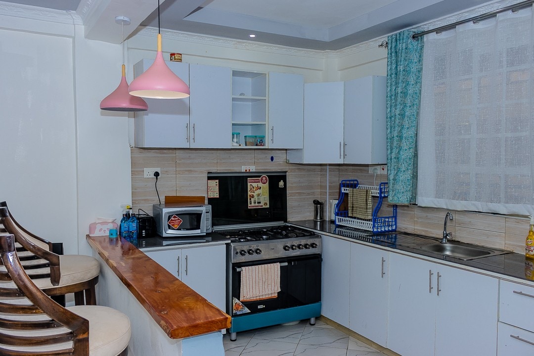 Brilliant sunset view that fills the mind with the most beautiful dreams. The apartment is a few mins from the mall. It's family friendly with a nice play ground,free parking,high speed WiFi among other amenities. The master bedroom is ensuite with a big bed(6*6). Both bathrooms have hot shower 🚿.Our kitchen is fully equipped with everything that that one would require(enough utensils,cooker,hot water jug, coffee,tea leaves,sugar). It's a home away from home.