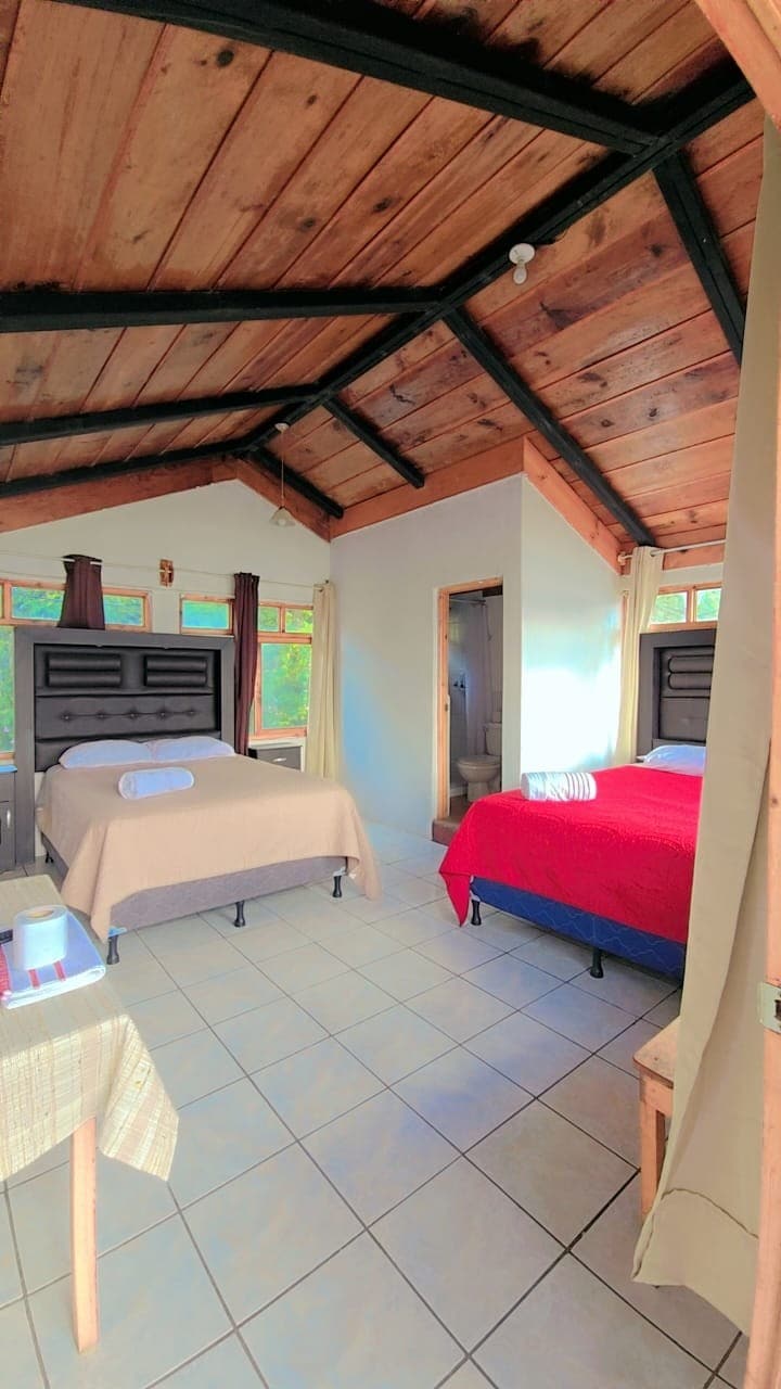 Hospédate en una amplia habitación con dos camas matrimoniales, ideal para 2 a 4 personas. Incluye desayuno gratuito en el rooftop con espectaculares vistas al lago y volcanes. Disfruta de atención 24 hrs, recepción dedicada y espacios modernos diseñados para tu comodidad. La habitación cuenta con cafetera con café y té, agua de cortesía, secadora y baño privado. Perfecta para familias o grupos que buscan confort y una experiencia única en Panajachel.