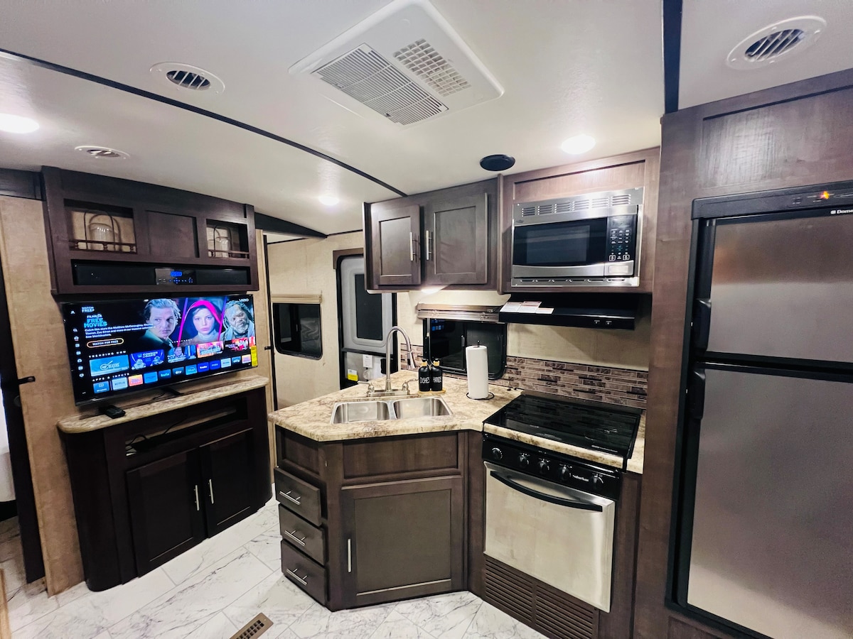 Phin's Den is ready for your adventure. It has an easy hitch hook up and can even be towed with any midsize SUV because of its lightweight design. It has plenty of storage space inside and out. It features a slide-out with jack-knife sofa that allows for versatility. The rear features a queen size bed with a mounted TV. The kitchen offers a convection oven and 2 burner stove. The outside features a 10 foot awning with LED lights and outdoor speakers.