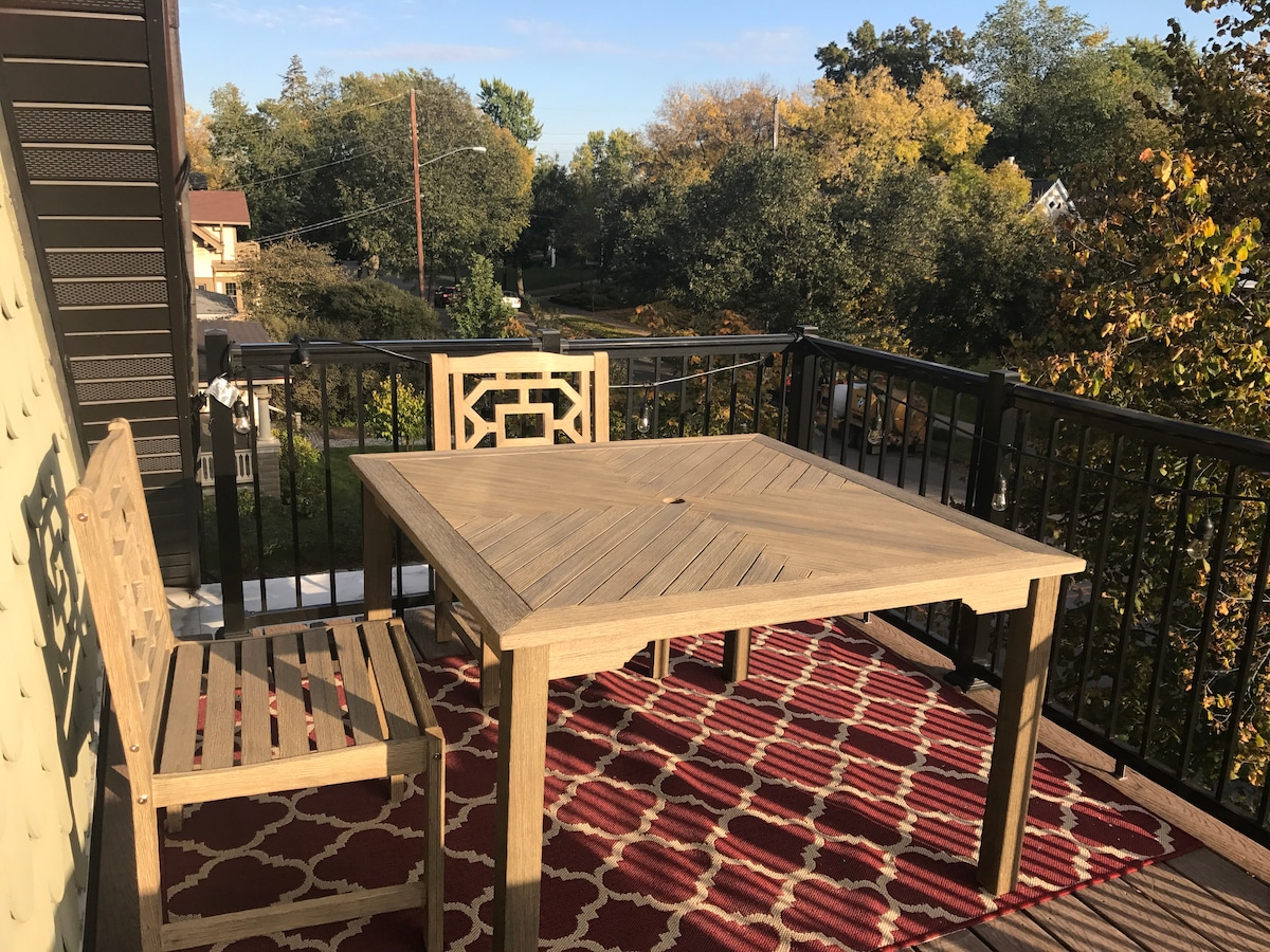 Objekat za pušenje. Šarmantni dupleks na 2. spratu u „Gradu jezera“. Privatni ulaz u dnevnu sobu sa TV-om, trpezarijom, kuhinjom, 2 spavaće sobe sa televizorima, kupatilom i privatnom terasom na krovu! (sezonski) Na pješačkoj udaljenosti od parka Harijet Bandshell (muzika tokom letnjih meseci) i Rouz Gardensa. Uživajte u srcu četvrti Kingfield, poznatom po kafićima, restoranima i sezonskoj pijaci Sunday Farmer 's Market. Jednostavan pristup aerodromu Uptown, Lyn-Lake, Downtown, Mall of America & Airport.