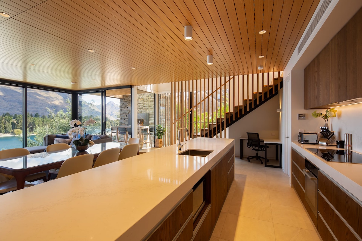 Kuća na jezeru 1 – pogled na jezero, parking, klima-uređaj i kamin Opustite se u ovoj luksuznoj vili na dva nivoa sa pogledom na jezero i planine, na samo tri minuta od jezera i restorana u Kvinstaunu. Uživajte u klima-uređaju, udobnom kaminu, privatnom balkonu i modernom dnevnom boravku otvorenog tipa. Savršena letnja baza za parove, porodice ili male grupe za istraživanje vinskih tura, avantura na jezeru, biciklističkih staza, golfa i živopisne scene restorana u Kvinstaunu.
