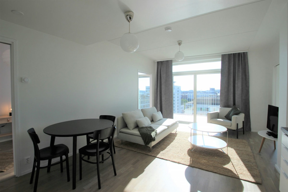 Stay in this new 3-room apartment with a sauna, completed in 2021, located in the center of Jyväskylä. Enjoy modern furnishings, a fully equipped kitchen, and a large balcony with stunning views of Lake Jyväsjärvi. The apartment includes a private parking space in the garage. Towels, linen, and internet access are included. All city center services are nearby, and the train station is just 500 meters away.