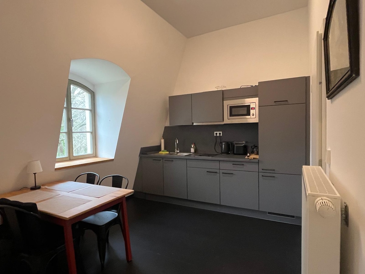 Iznajmljujemo mali stan u našoj kući od slame u Markkleebergu. Objekat se nalazi u tišini, nedaleko od Markkleeberger See. Naći ćete jednosoban stan na mirnoj lokaciji, sa sopstvenom kuhinjom i malim kupatilom. Vanjski prostor vas poziva da se zadržite. Između kokošaka i pataka možeš se divno opustiti. Takođe veoma pogodno za decu i porodice. Različite izletničke destinacije na selu moguće. 15 minuta vožnje do Leipzig centra (automobila).