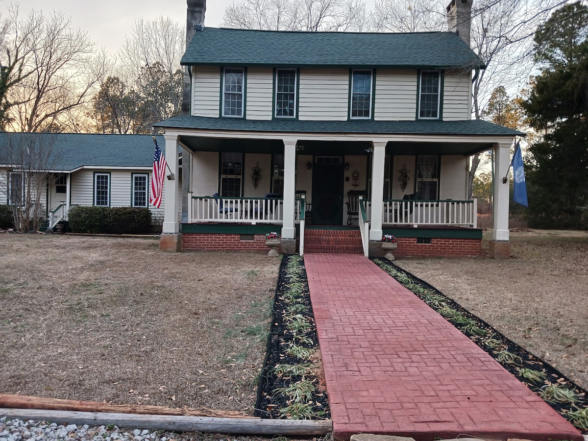 Decked out for the Holidays! Just 5 min to Carolina Motorsports Park! This cozy home sleeps 6! The primary bedroom features a queen bed & daybed, living room has a pullout sofa. Strawberry-themed kitchen is bright and fully equipped, connected to a large dining room for meals and gatherings. DR has add'l daybed. Updated bathroom offers modern comforts, front porch has swing w/rocking chairs. A workspace, charming music-themed nook add function and charm. $75 non-ref. pet fee for