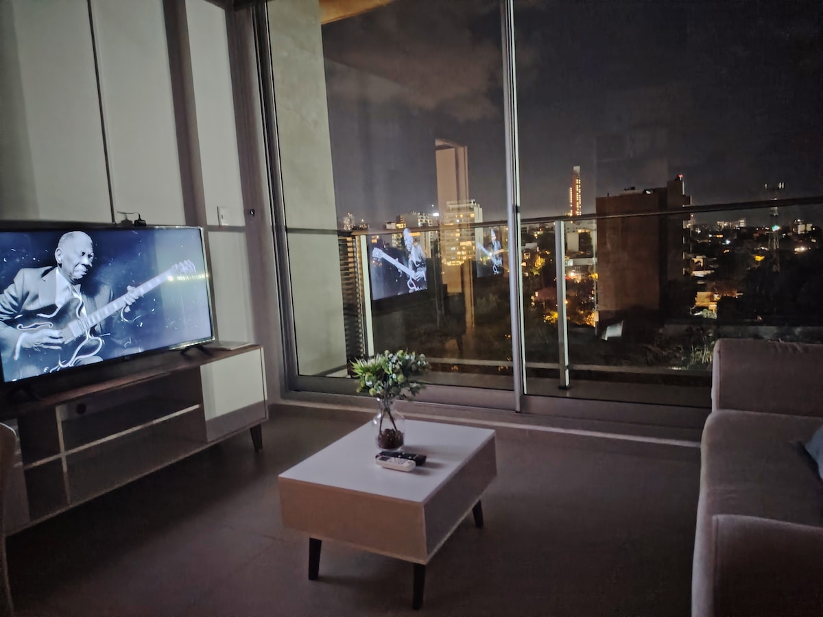 Discover the charm of Recoleta from our seventh floor one-bedroom apartment with breathtaking panoramic views. Located in one of Asuncion's top neighborhoods, this area is known for its safety and vibrant restaurant scene. Just 500 meters from Shopping Mariscal and Villamorra, you'll have the best shopping and dining options nearby. The building is new and designed with Airbnb guests in mind, offering 24-hour service, a swimming pool, gym, and a terrace grill area for up to 12 people.