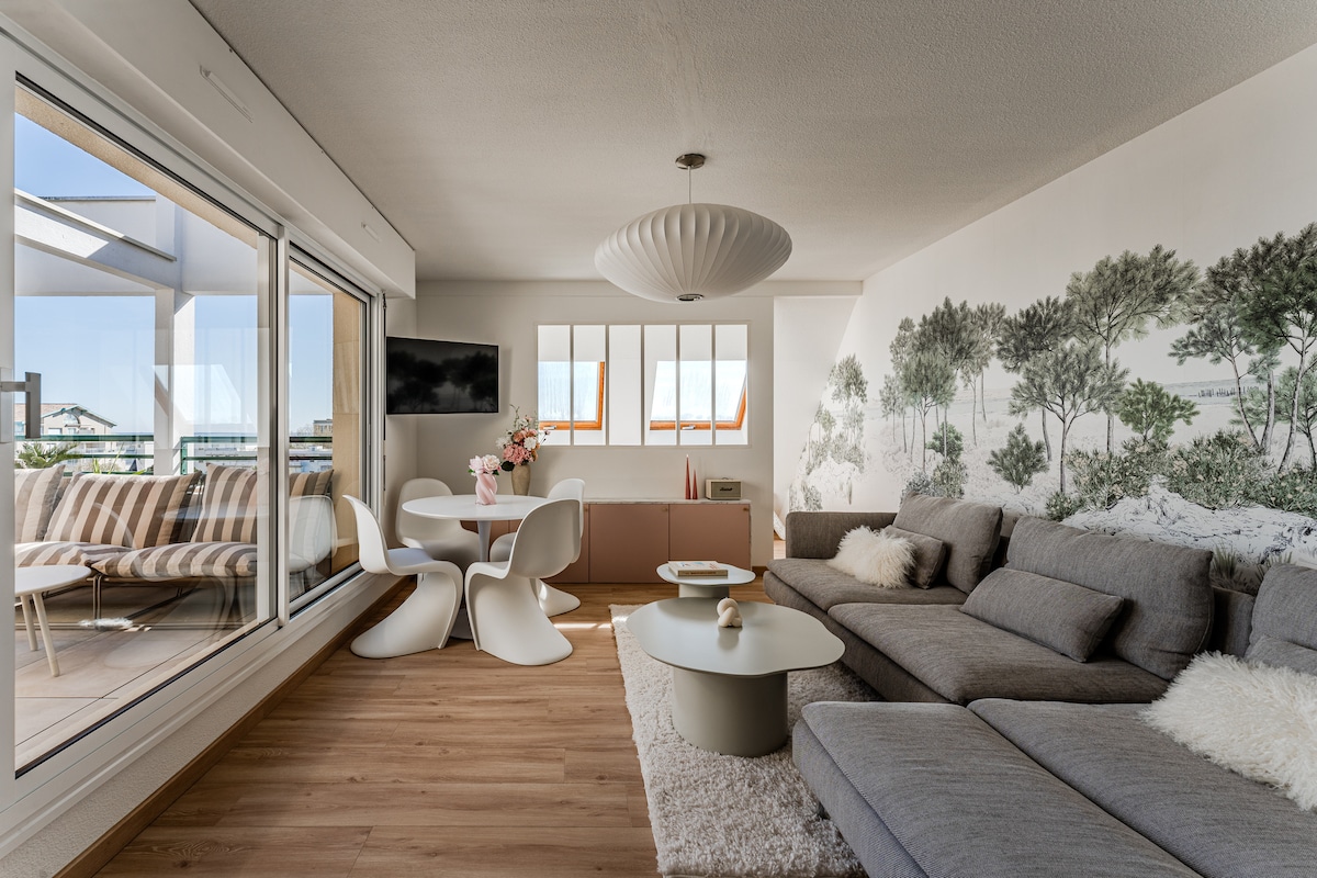 Vrlo lep stan od 120 m2 sa panoramskim pogledom, parkingom, renoviran u avgustu 2018. godine, nalazi se na obali mora sa terasom, na 4. spratu luksuzne rezidencije. Idealno se nalazi na 10 minuta hoda od Gare d 'Arkašona i 100 metara od ulice za pešake sa mnogo restorana. Vrlo lepa plaža sa pogledom na rezidenciju (Plage Thiers). Čuveni pristanište Thiers udaljen je 200 metara od kojeg se svake godine vuče vatromet 14. i 15. avgusta.