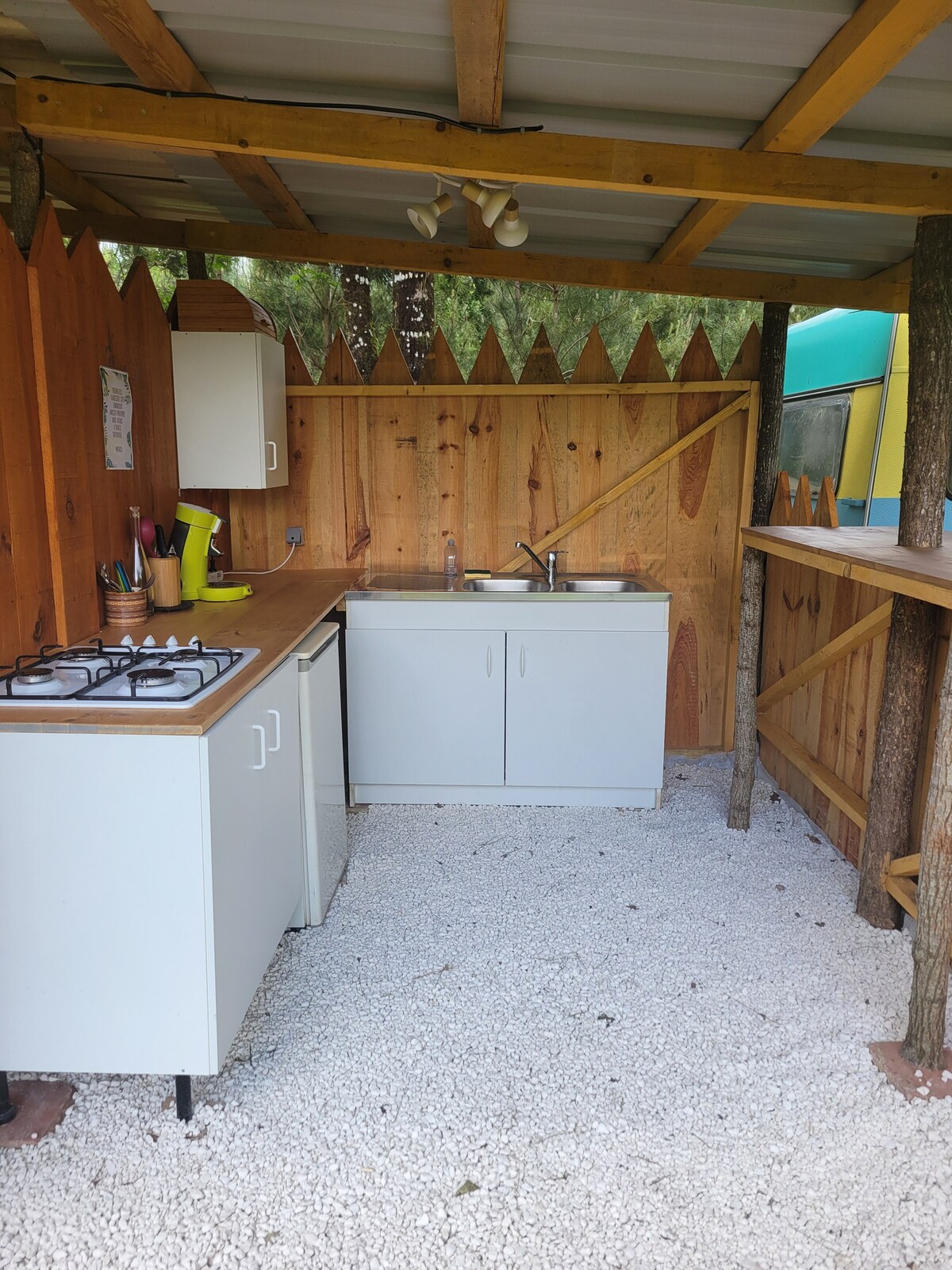 Au sein d'un petit camping chez l'habitant, cette tente équipée est unique, et dispose de son propre espace. Equipé d'une cuisine, de deux chambres avec lits confortables, et d'un salon, il a un auvent de 10 m2 et ses propres toilettes sèches. Equipé d'électricité, et l'eau potable est accessible à volonté par un robinet extérieur Vraie douche extérieure avec eau chaude, spacieuse et agréable. Le reste des équipements se partage avec quelques campeurs : espaces et vaisselle, abri. Endroit calme.