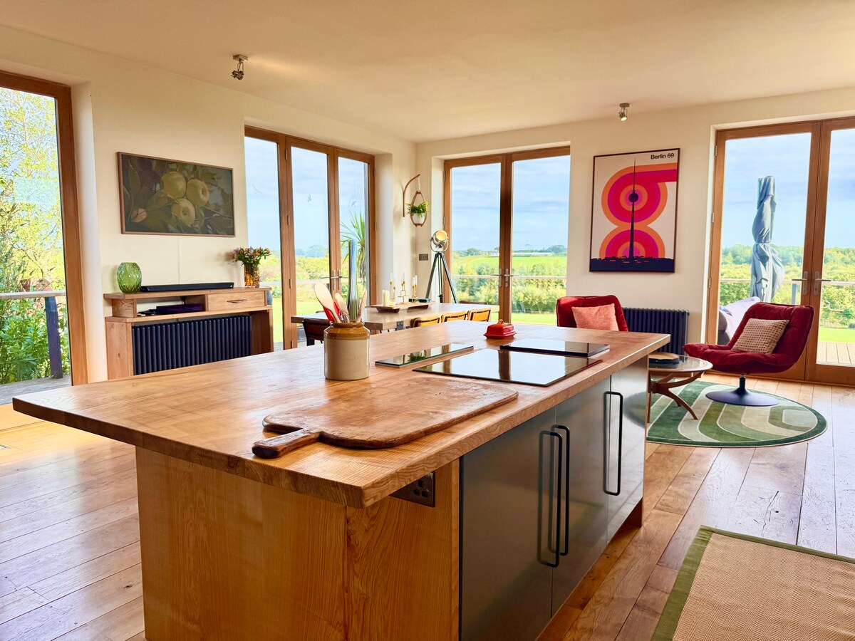 Miran, duboko luksuzan prostor za punjenje i ponovno povezivanje. Šipon je pedantno preuređena štala za krave sa grejanim, poliranim betonskim podovima, nežno zakrivljenim dubokim zelenim zidovima, ručno izgrađenom kuhinjom, toplo osvetljenim kutovima za čitanje i prirodnim materijalima. Vuneni pokrivači, sofa s perjem, starinski skandinavski plamenik za drva, krevet u kraljevskoj veličini s francuskom posteljinom i tušem, tuš-kabina i najmekši ručnici. Naše pospano selo Devon osvijetljeno je samo zvijezdama noću. Možda ćete samo spavati bolje nego što jeste godinama.