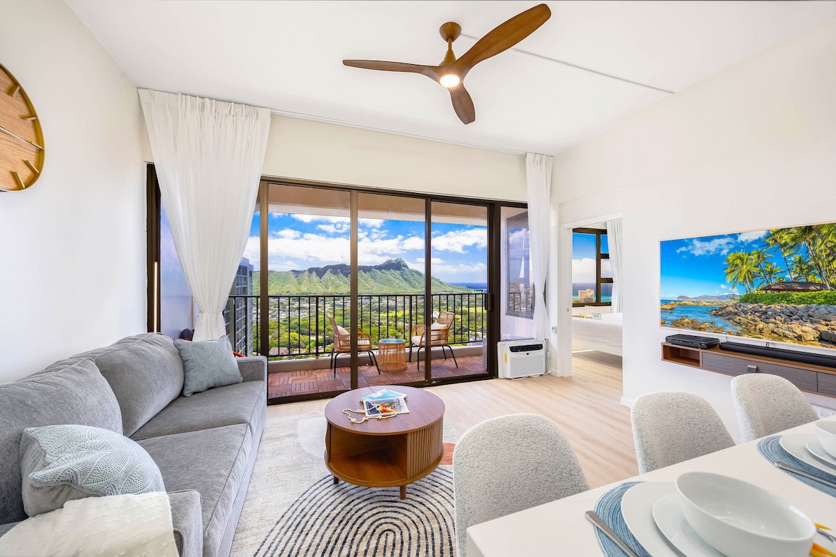 Smještena visoko na 34. spratu Vaikiki Banjana, ova kraljevska jednosobna jedinica sa besplatnim parkingom (maksimalno 6') nudi uzvišeni doživljaj. Iz svog Lanaja, uživajte u Aloha vremenu dok uživate u pogledu na prelijepi okean i pogled na dijamantnu glavu. Bez obzira na to da li želite da hibernirate u bračnom krevetu u spavaćoj sobi ili na kauču na razvlačenje u dnevnoj sobi, prostor će vam biti privlačan i opuštajući. Osim toga, plaže su praktično blizu - samo 5 minuta hoda ili 2 bloka dalje. Uživajte u boravku!