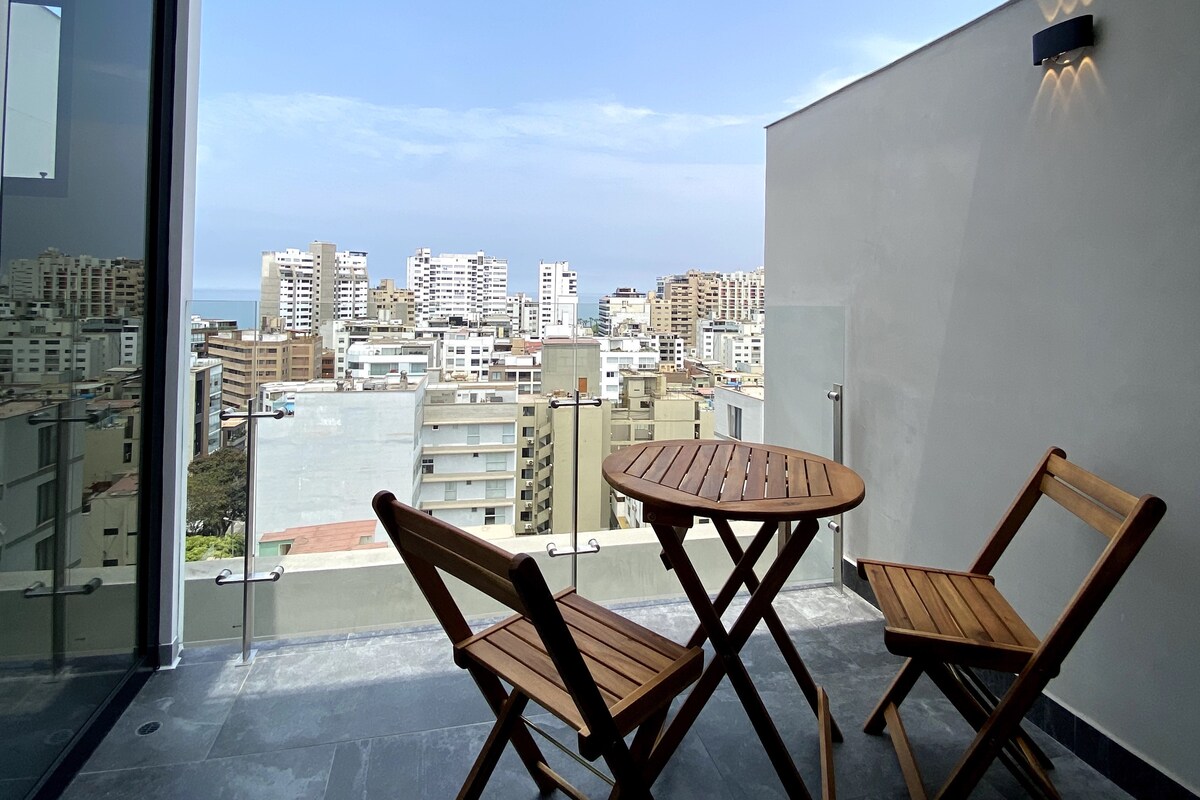 Uživajte u srcu Mirafloresa boraveći u ovom modernom potkrovlju s balkonom s pogledom na okean, 2 bloka dalje od Larkomara. Strateška lokacija za šetnju obalom, posjetu parku Kenedi, uživanje u našoj gastronomiji ili isprobavanje novih avantura kao što je paraglajding! Potpuno opremljeno potkrovlje: -1 Br bračni krevet (smart TV) - Čajna kuhinja - Kupatilo - Balkon s pogledom na okean/ zalazak sunca - čaršafi/ peškiri hotelskog kvaliteta - Teretana i prostor za pranje veša u zgradi Odsjednite kod nas i uživajte u drugačijem doživljaju!