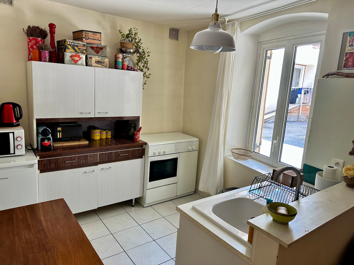 Renovirani stan od 28 m2 na prvom spratu naše kuće sa pristupom spiralnim stepeništem. Terasa od 18 m² okrenuta ka jugu, nesmetan pogled na planine. Mirno okruženje. 1 soba sa opremljenom čajnom kuhinjom, dnevni boravak sa TV-om, Wi-Fi, kauč na razvlačenje, 1 spavaća soba sa bračnim krevetom (140 x 190 cm) i dva kreveta na sprat (90 x 190 cm). 1 kupatilo sa tušem i WC šoljom. Idealan smeštaj za dve osobe, moguće najviše četiri osobe. Parking na privatnom parkingu. 900 m od centra grada i železničke stanice.