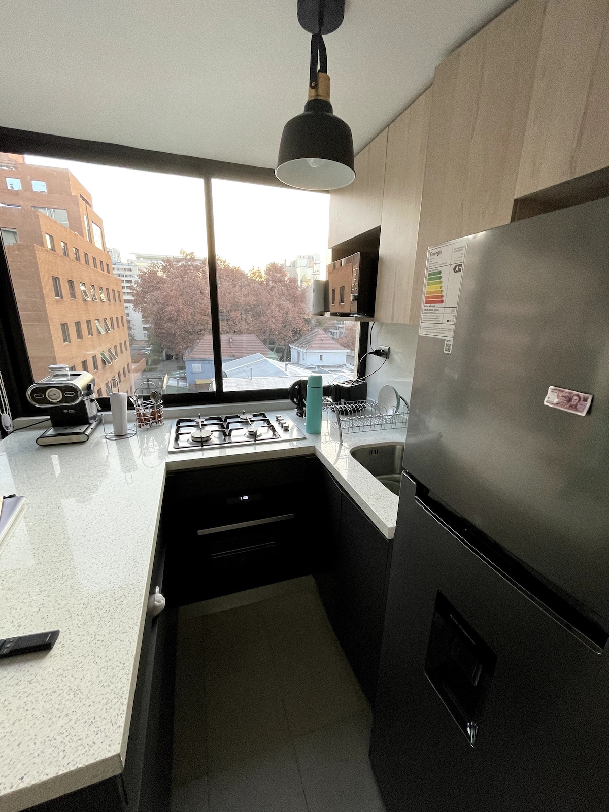 Studio, modern design, ThermoPanel for acoustic and thermal insulation, A/C. Located in the top-rated area in Santiago. Steps away from Tobalaba Metro station, from best restaurants in Santiago, from Costanera Center Mall, cafes and a supermarket. Excellent wifi, free of gas appliances, Cable TV, Smart TV 55" curved screen, nice bathroom. All in a safe neighborhood with many services. For security reasons, it is required to send us, after booking, photos of ID and selfie of each guest.