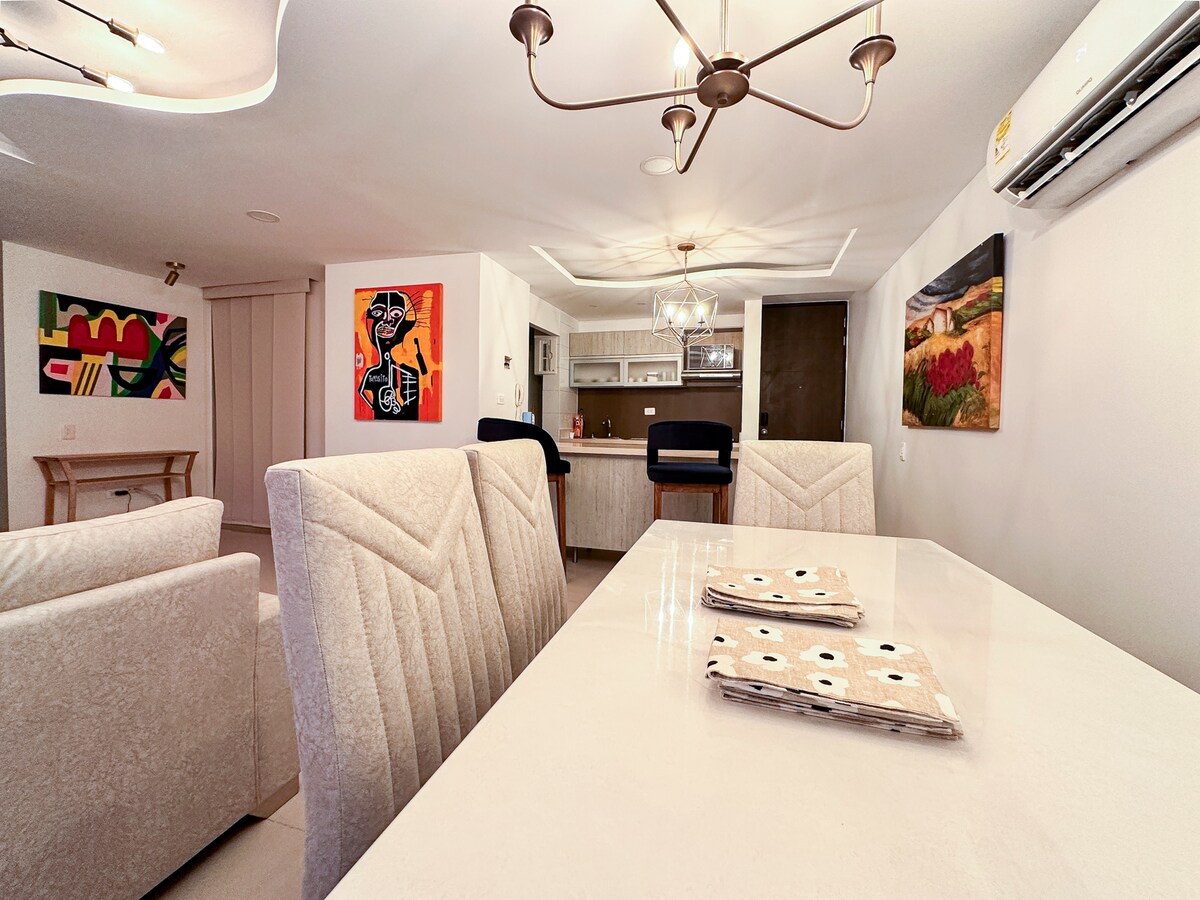 Beautiful apartment in Barranquilla’s northern zone on 46th St (on the exit to Cartagena). It has 2 bedrooms with private bathroom, walk-in closet, Smart TV. 6 beds. Social bathroom, working area, living room with Smart TV and dining table. Fully equipped kitchen as well as washing, drying and ironing stations. PET FRIENDLY with beds and plates for your pets. Homely environment, new, quiet, with modern common areas like gym and pool. You’ll feel quite at home here.