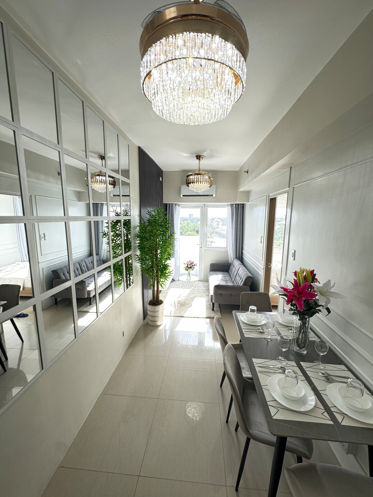 Doživite moderan luksuz u ovoj elegantnoj, svetloj garsonjeri. Savršeno optimizovan za udobnost, ima plišani bračni krevet, udoban kauč i elegantan radni prostor ispod 55-inčnog 4K televizora. Nalazi se odmah preko puta SM Southmall-a za vaše potrebe za obrokom, kupovinom i zabavom. Posebnosti: Elegantan dizajn: Zapanjujući kristalni lusteri sa ventilatorom i zlatnim detaljima. Potpuno opremljeno: Kompaktna kuhinja sa mikrotalasnom pećnicom, frižiderom i pločom za kuvanje. Vrhunska udobnost: ogledala na vratima ormarića, zavese za zamračivanje i klima-uređaj.