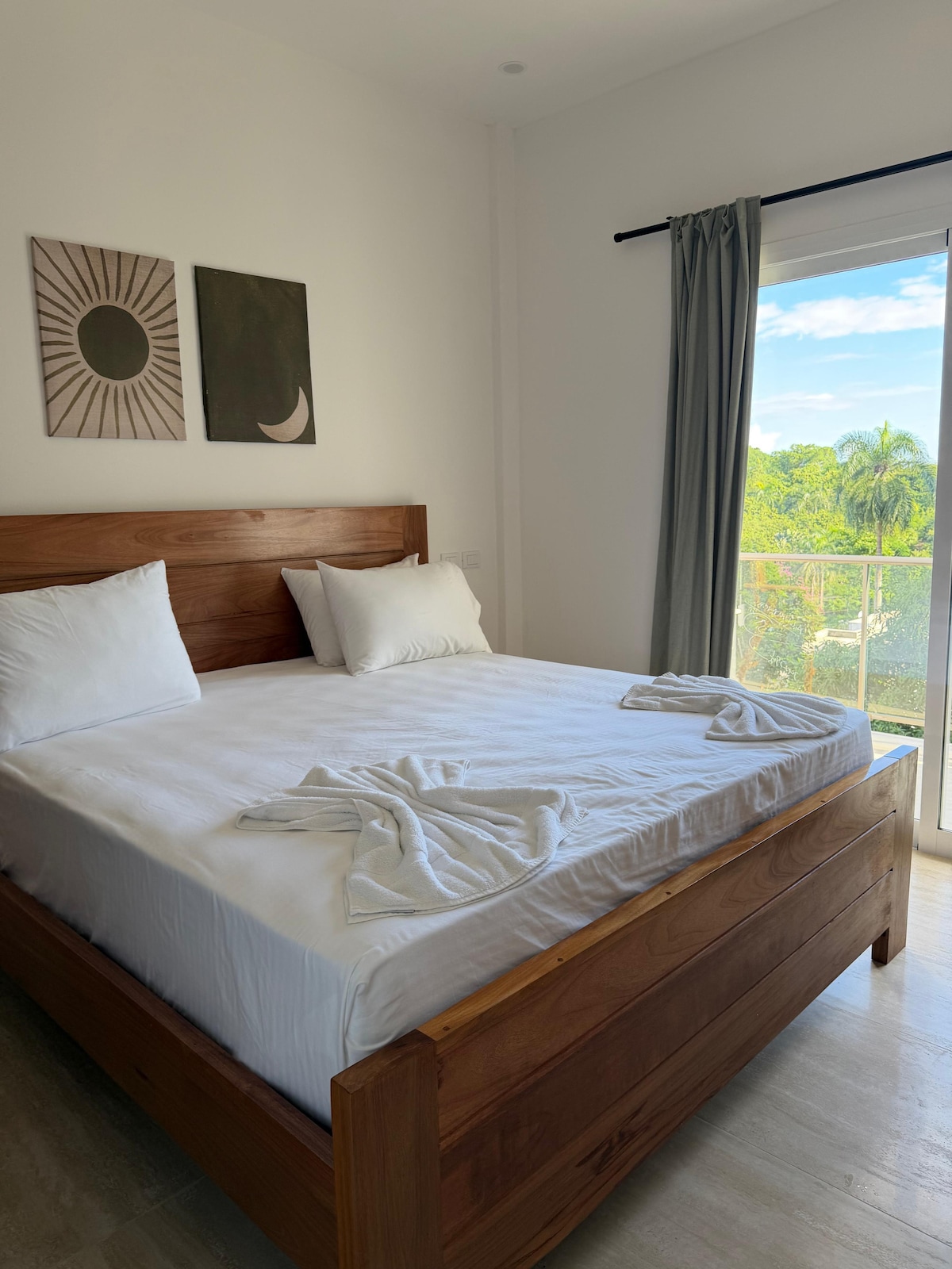 Escape to paradise at our newly renovated, spacious boutique hotel. Our eco-friendly hotel is steps from the beach in the heart of Las Terrenas! Wake up to stunning ocean views, unwind by our luxurious three-tiered pool surrounded by palm trees, or feel the ocean breeze as you relax in the sun. With tropical serenity, modern luxury, and the beach just minutes away, your perfect getaway awaits! The Suite Includes a king size bed, ensuite bathroom, and air conditioning.