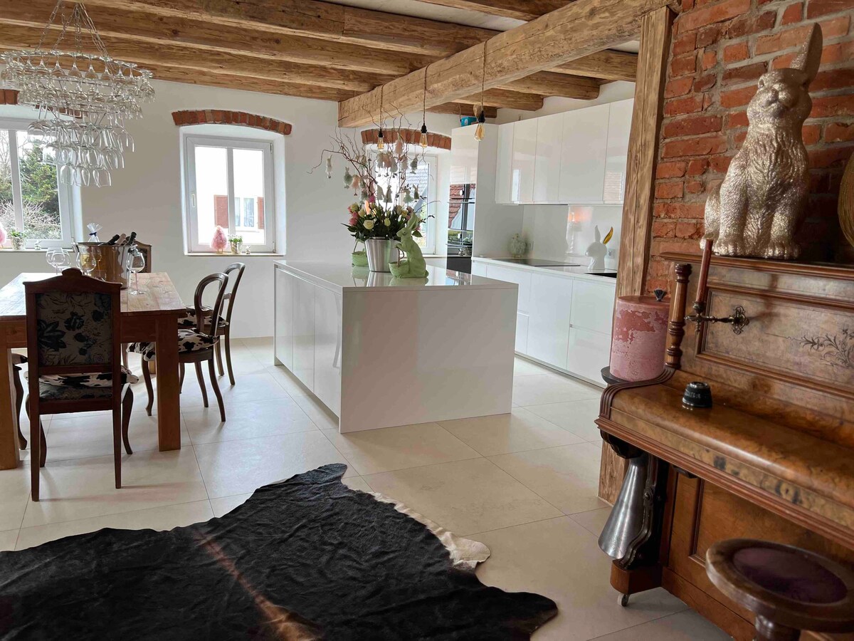 Kuća na selu iz 1868. godine, opremljena s pažnjom posvećenom detaljima. Sa prostranom kuhinjom/trpezarijom i dnevnim boravkom, da se zadržite, kuvajte zajedno, za miran odmor. Naša kuća ima dve odvojene spavaće sobe i prostrano kupatilo sa ogromnim tušem. Mnoge prelijepe biciklističke staze duž Dunava ili Zusama. Vaš Jura aparat za kafu sa ovsenim i bademovim mlijekom je već spreman. Slobodno nas upoznajte kako bismo proslavili, takođe sa porodicom i prijateljima, po prethodnom dogovoru
