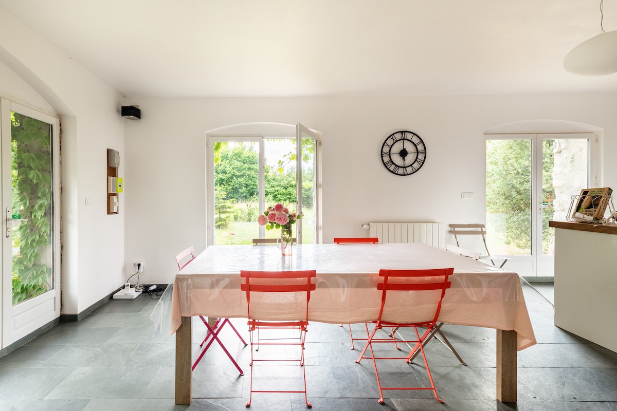Dopustite da vas zavede ovaj neodoljivi miran smeštaj, na izlazećem suncu i okružen prirodom. Spavaća soba na 1. spratu sa pogledom na voćnjak, sa krevetom 140/200, stolom, foteljom i komodom. Prostrani krevetac u privatnom kupatilu Zajednička kuhinja je dostupna samo za vegetarijansku hranu. Obrok u dnevnoj sobi ili na terasi u blizini povrtnjaka sa cvećem. Biciklistička garaža. Jezero 10 minuta hoda. Parling front of the door. Doručak nije uključen. Dvije mačke.